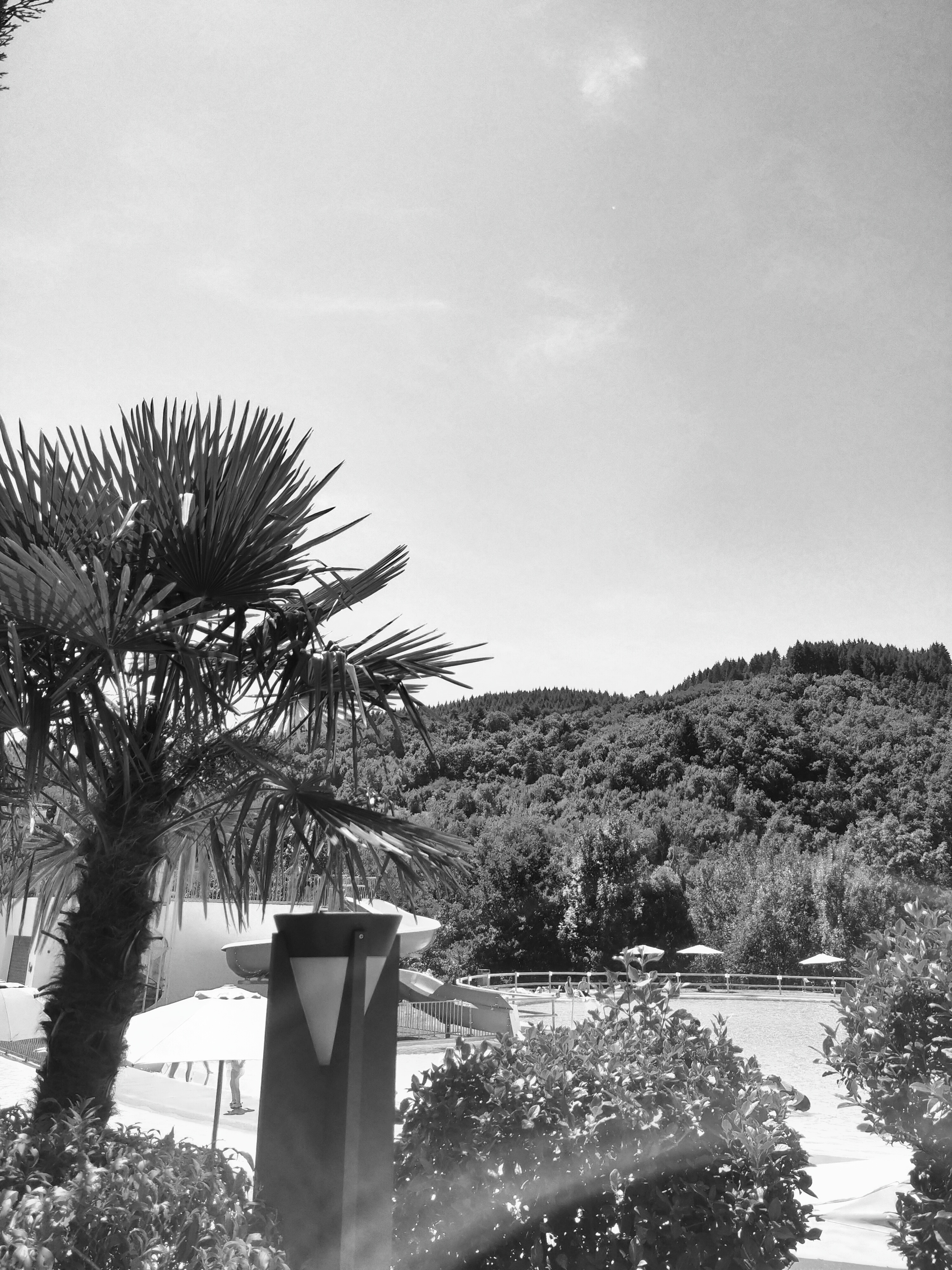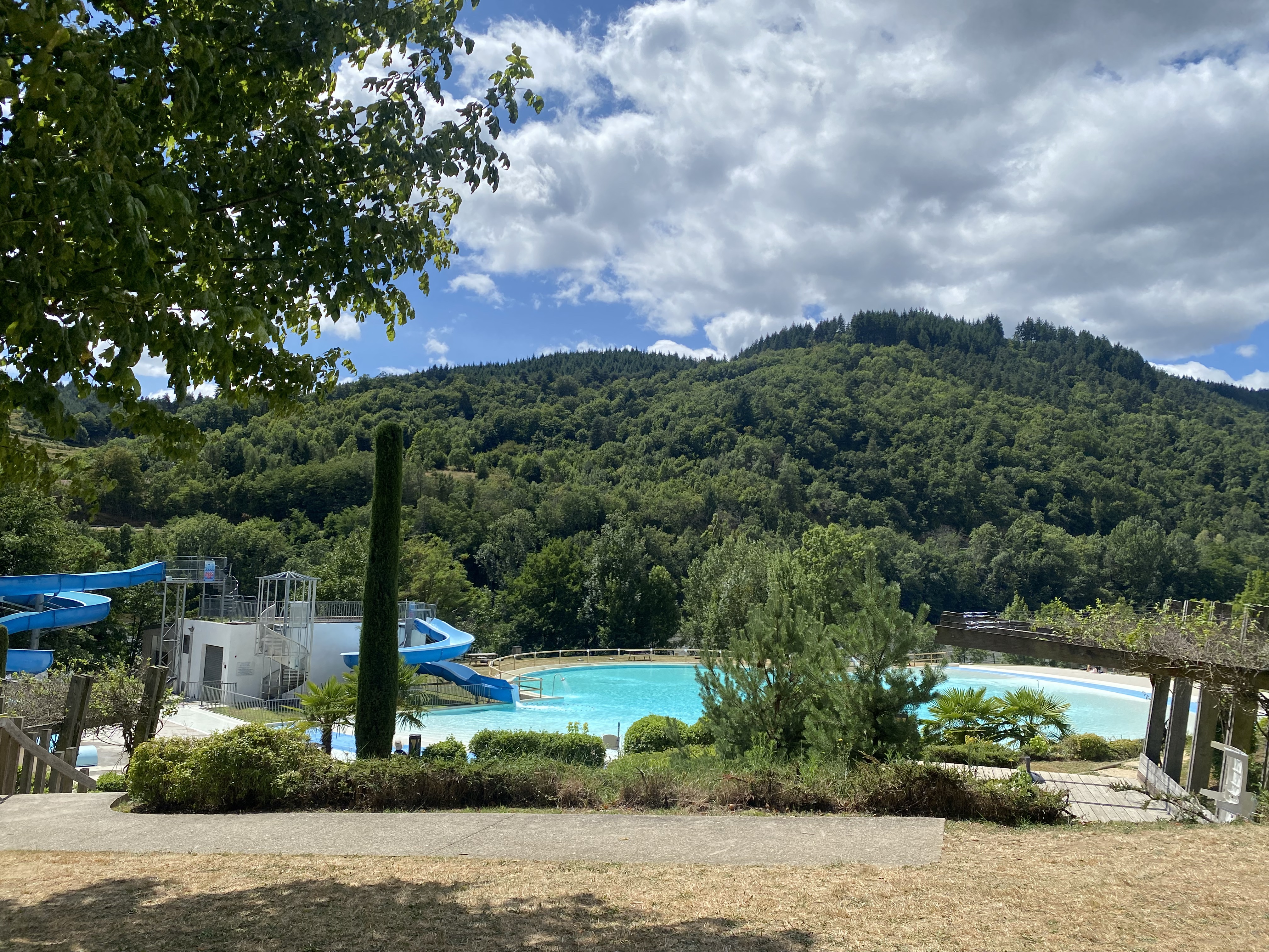 Très belle vue sur la nature environnante , des espaces verts agréables, système de location transat et parasols pratiques. Eau propre, bassin et toboggans sympathiques, beaucoup de fuites d'eau sur les toboggans, gaspillage d'eau de même que les WC n'ont pas de système d'économie d'eau.