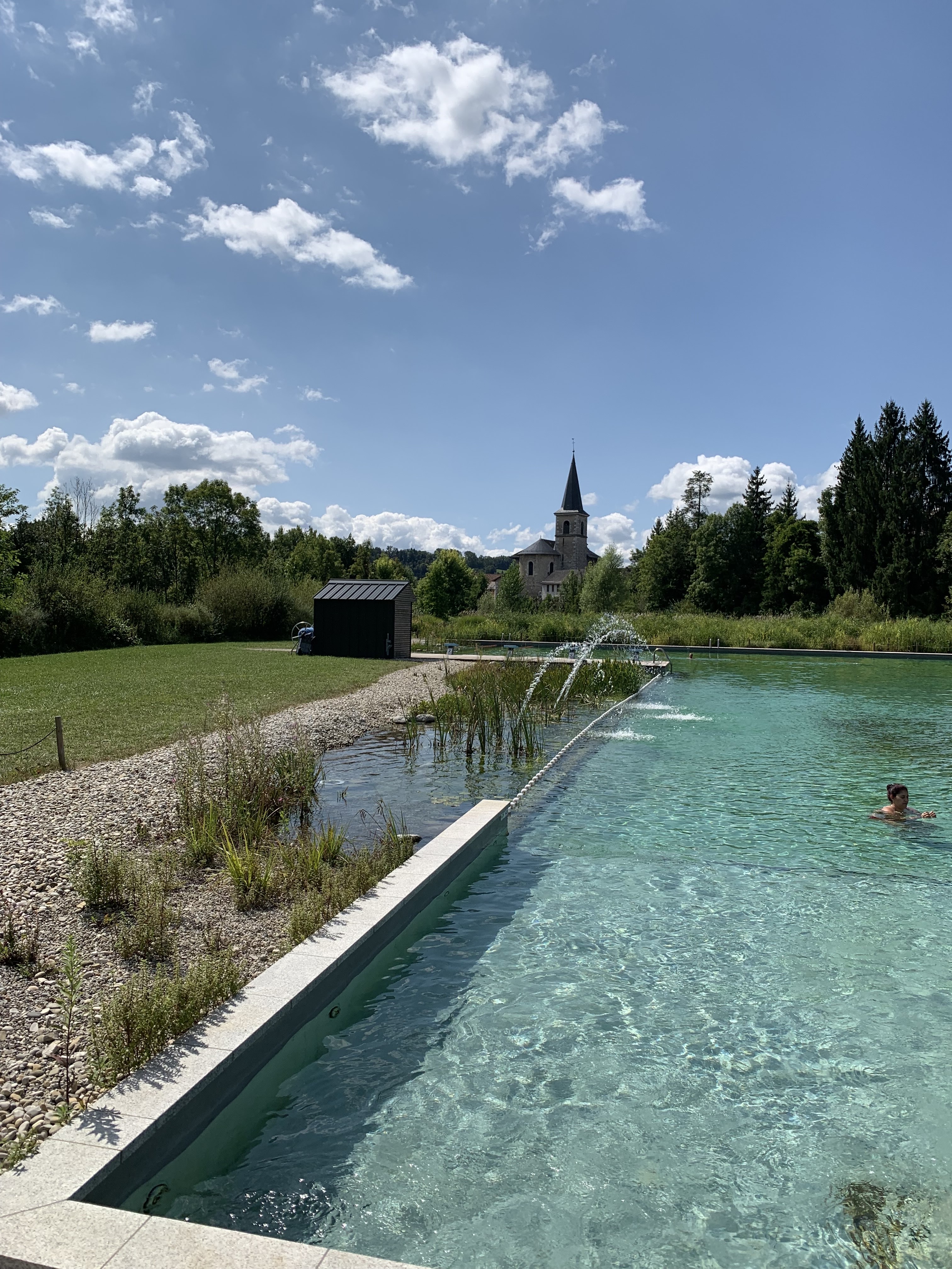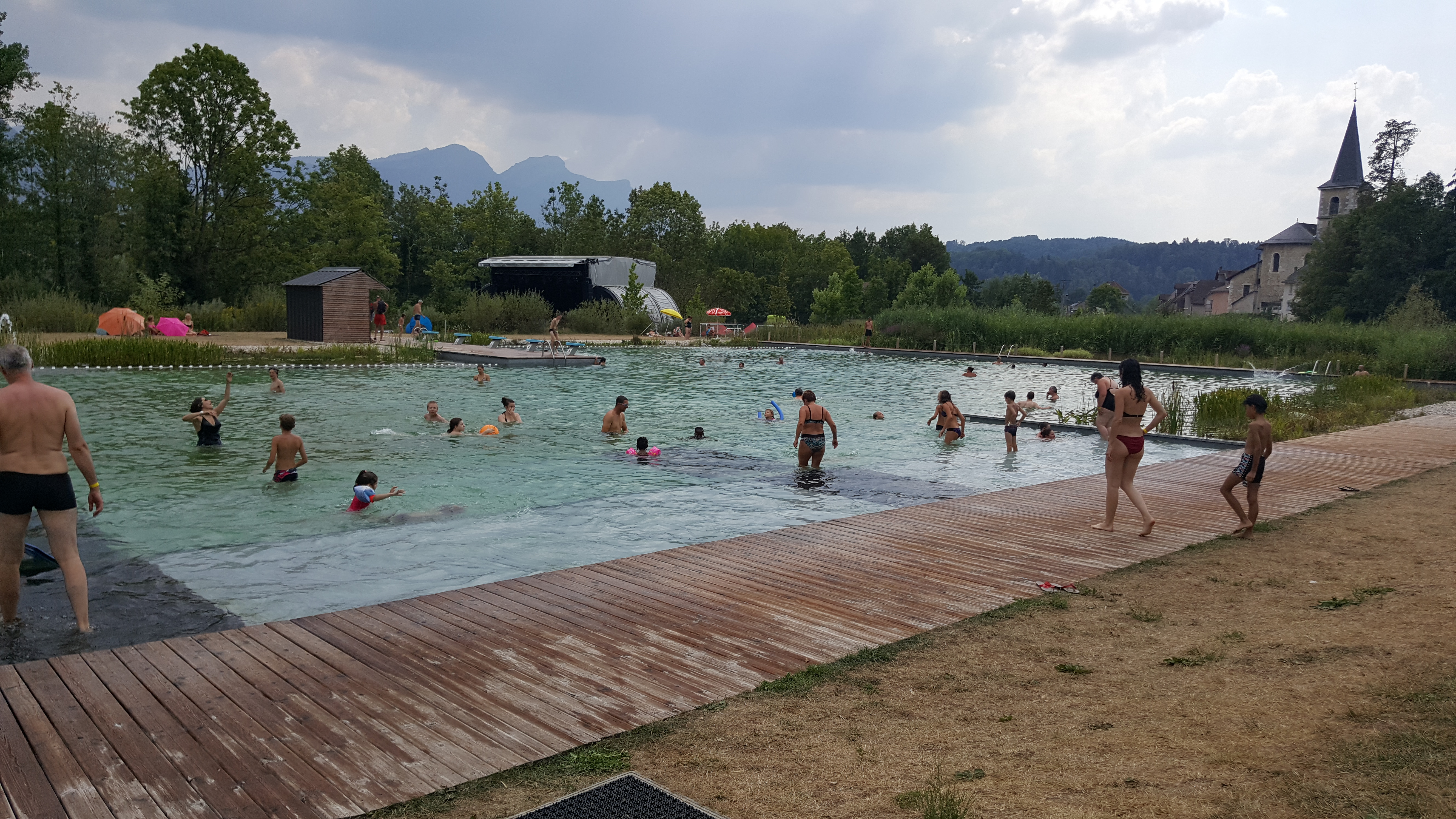 Un lieu en plein village parfait pour se rafraîchir avec l’avantage d’un bassin écologique, sans chlore, que c’est agréable ! Il manque encore quelques arbres pour faire des espaces ombragés, et éviter ainsi de se tartiner de crème solaire qui finira dans l’eau...