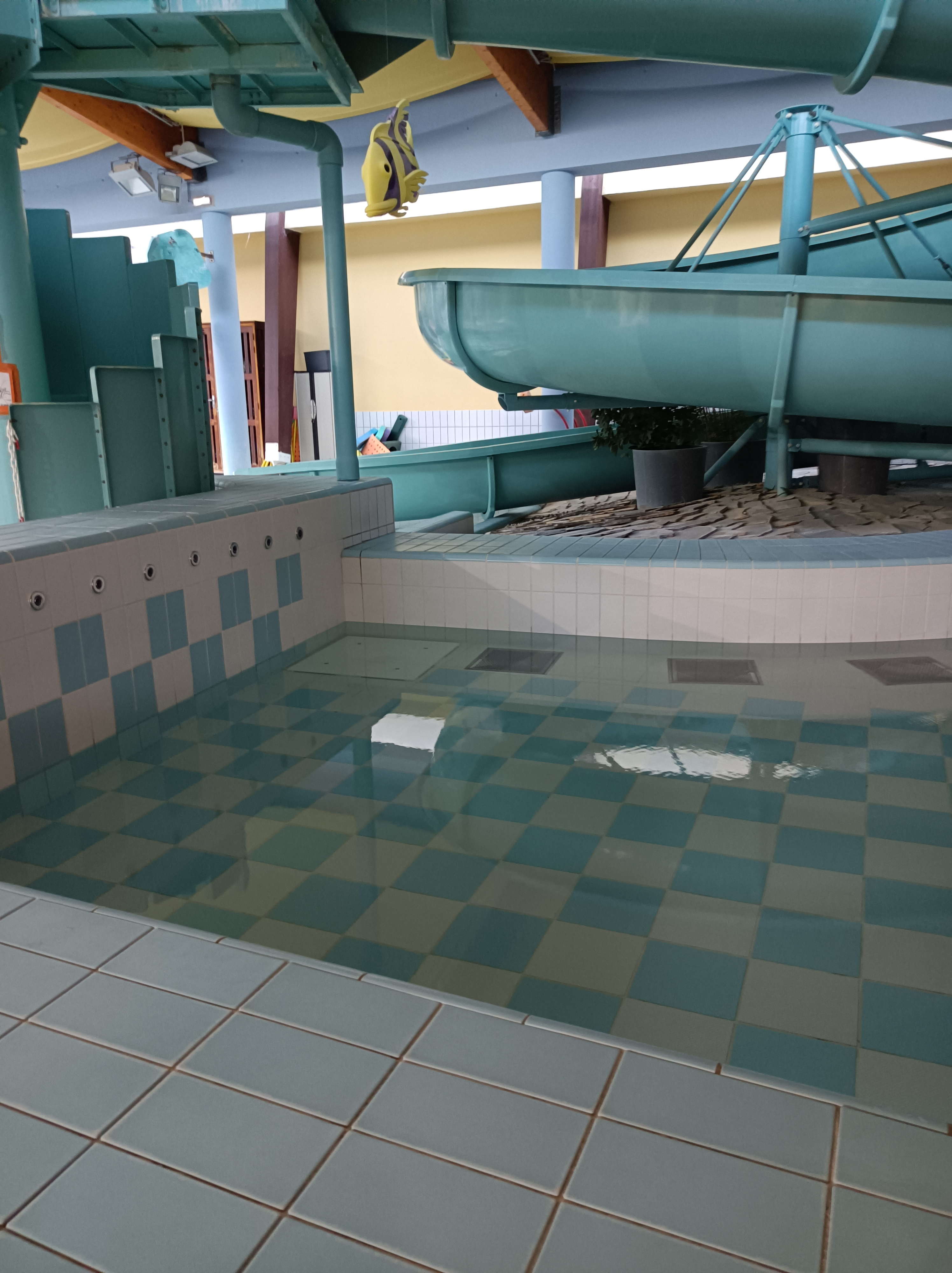 Bonne piscine. Il y a un grand bassin de natation, une pataugeoir et un bassin ou l'on trou e un jet de pieds et des bulles ainsi qu'un toboggan À l'extérieur on peut se reposer sur l'herbe et les enfants peuvent profiter des nombreux jeux d'eau extérieurs. Au niveau des douches, des petites baignoires permettent de laver plus facilement les bébés Point positif, le sol ne glisse absolument pas ni fans les vestiaires ou les douches ni vers les abords des bassins Seul bémol le bassin dans lequel arrive le toboggan est trop petit ou mal agencé car les personnes faisant du toboggan arrivent environ à 1 mètre à peine des personnes souhaitant profiter des bulles....