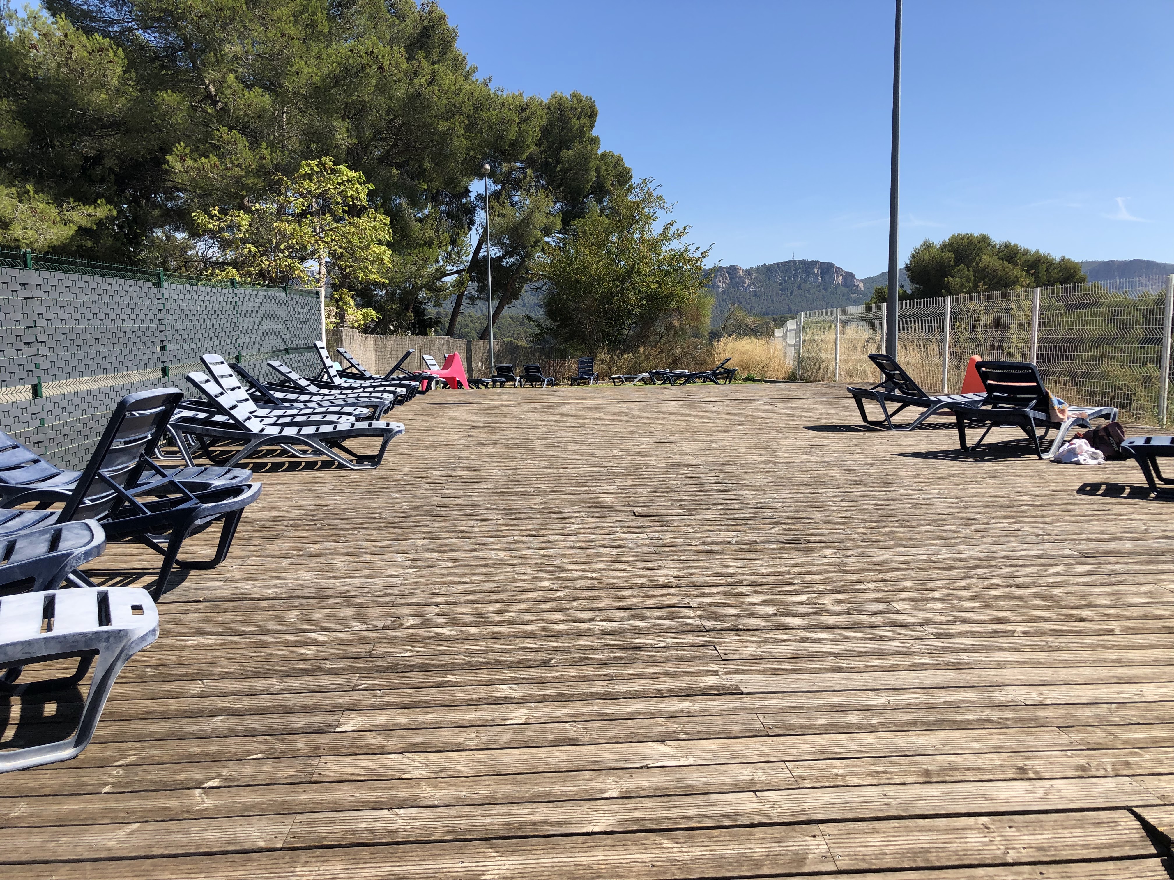 Le cadre est vraiment sympa en pleine pinède. Il y a une terrasse sur laquelle on trouve des transats, sympa pour fuir le brouhaha de la piscine quelques minutes. Le petit bassin plutôt réservé aux enfants était bondé de monde. Ça en était désagréable. Les plus grands jouaient au ballon sans se soucier de ou est ce qu'il allait atterrir... des courants d'air franchement désagréables... et surtout un gros manque de propreté ! Des traces noires partout sur le sol, des cheveux dans la piscine dans les douches au sol.... des petits déchets éparpillés dans les vestiaires... une horreur ! Notre fille s'est régalée, elle a pu nager, j avec les frites à disposition, déambuler toute seule dans le bassin peu profond... mais alors nous une vraie horreur tellement c'était sale !