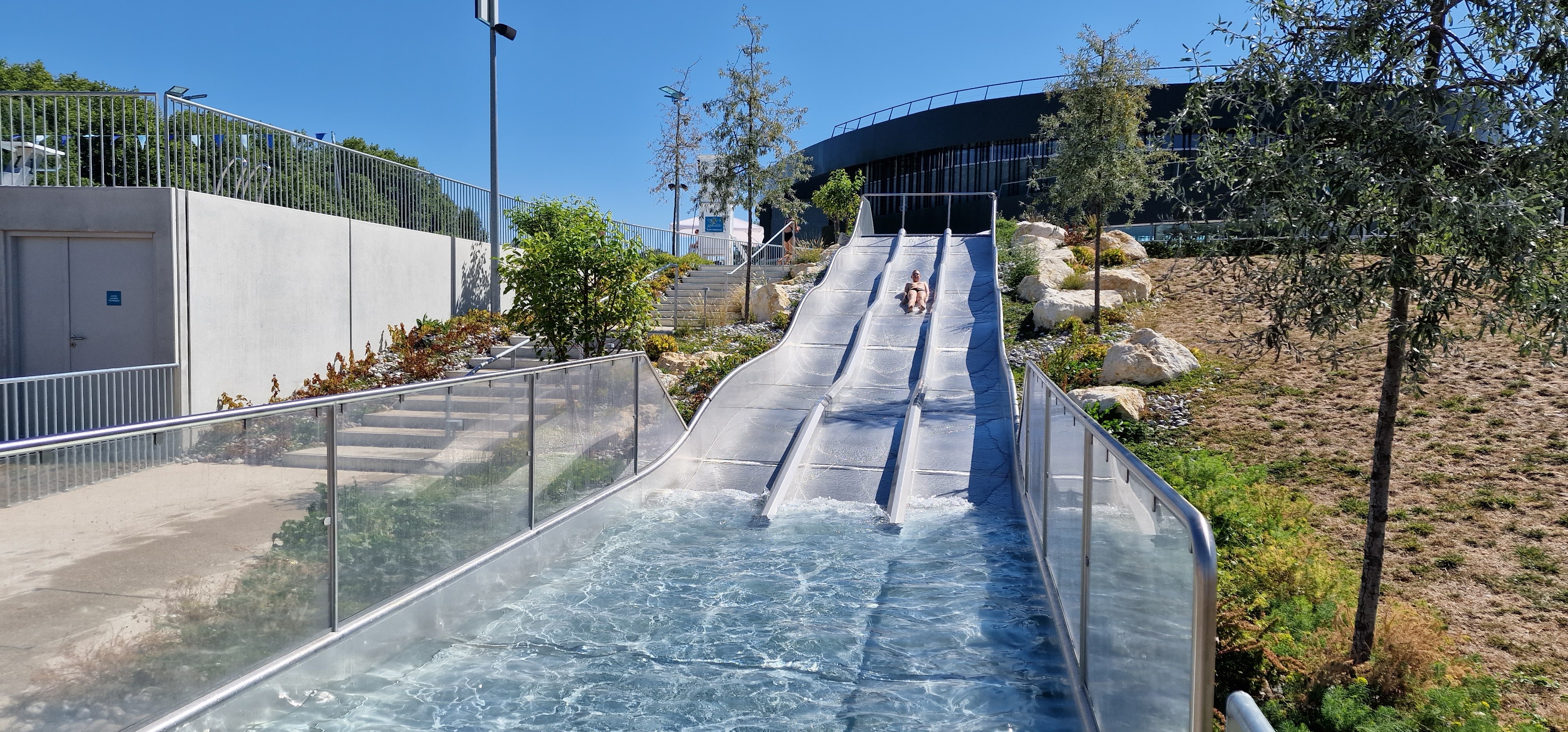Wouah très surpris. Quelle prouesse architecturale et très bien avancée. Parking pmr. Rampe d'accès bien pensée. L'eau est chauffée intérieure comme extérieure ! Le top Merci