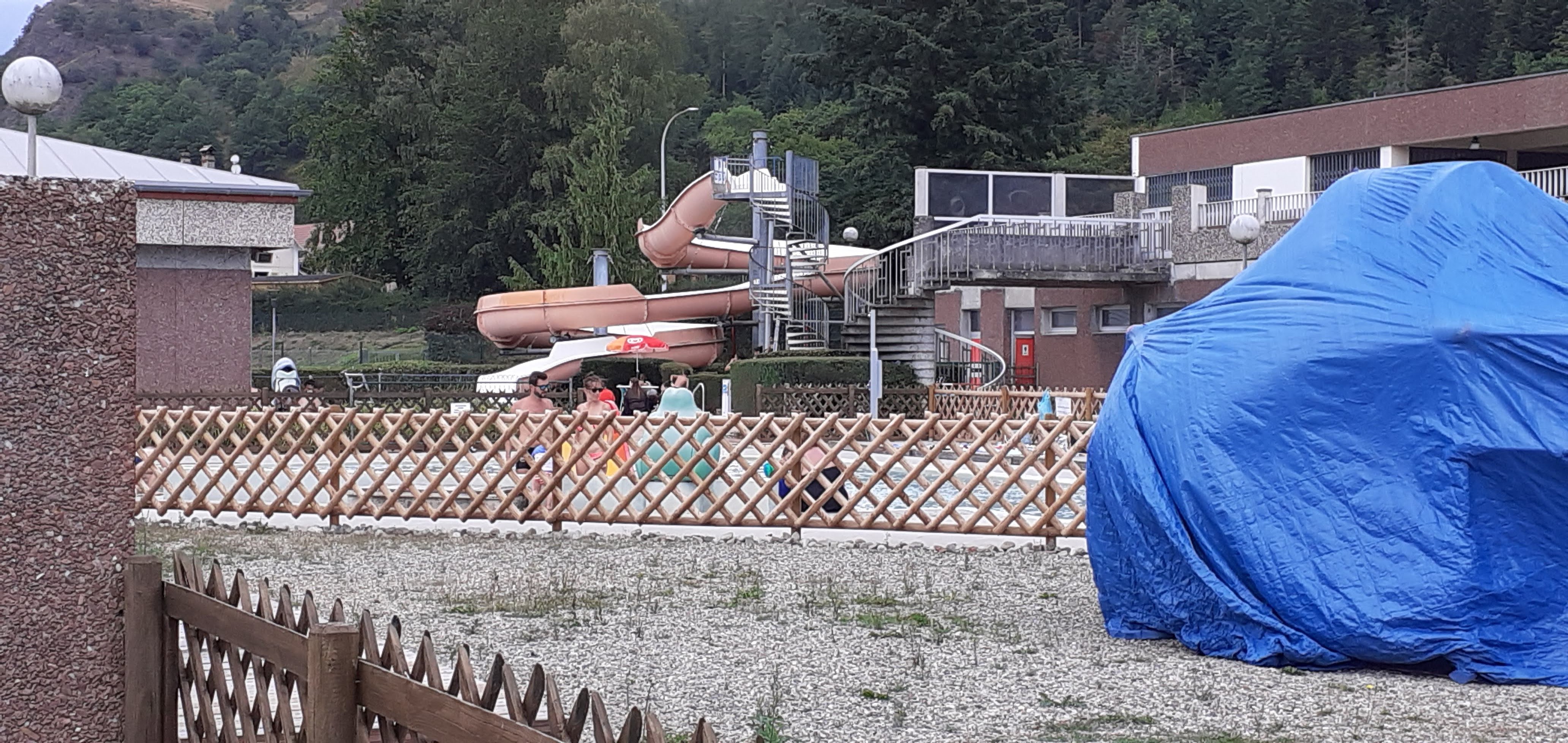 Piscine vieillissante mis parfaite pour les temps de canicule, deux toboggan et plusieurs espaces e baignade pour tous les âges