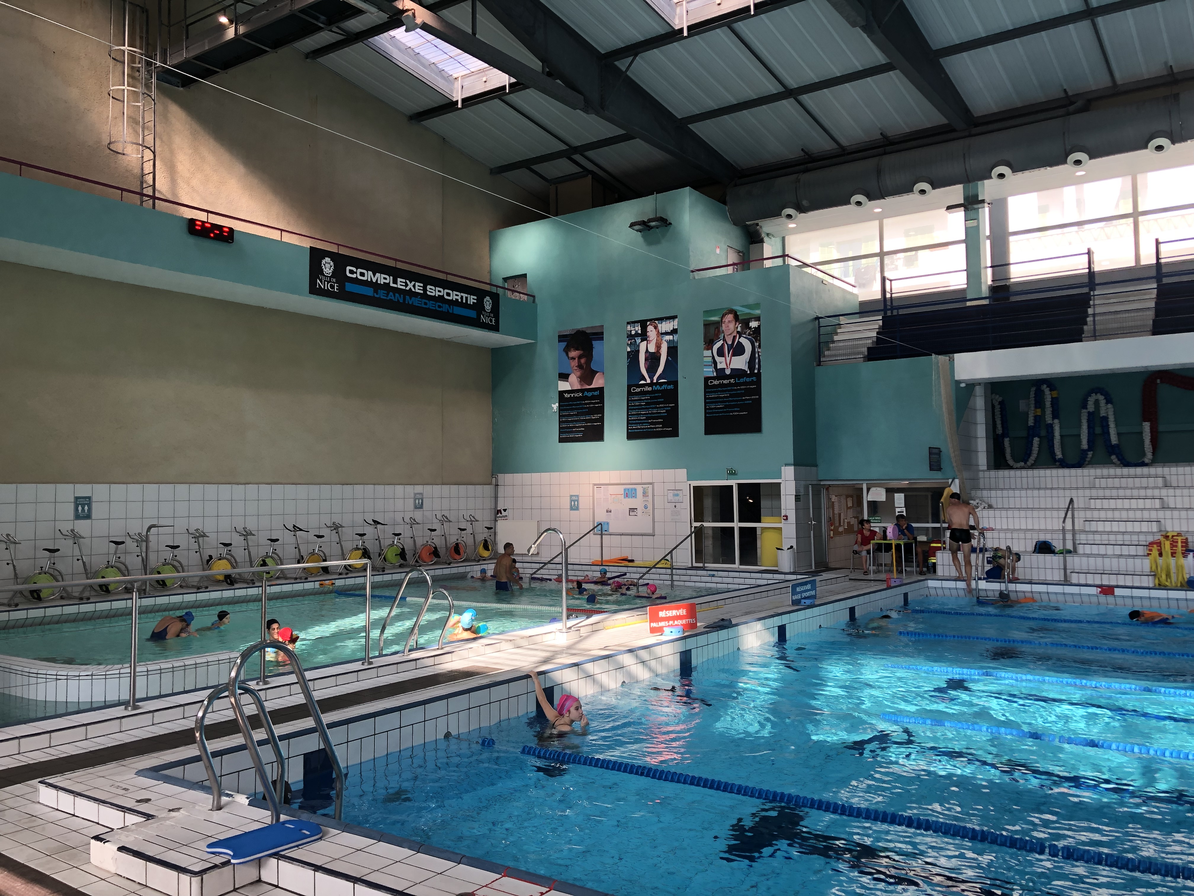 C'est un lieu rénové. Avec deux bassins. Mon neuveyx fait des compétition la bas. Et il y a un gym club musculation et sinon oui on prends un café ☕ à la cafetaria et on peut aller à l'étage regarder mon neuveux nager. Il faisait pas très chaud 🔥 🔥 🔥 c'est agréable sinon en semaine, on peut venir nager sans problème.