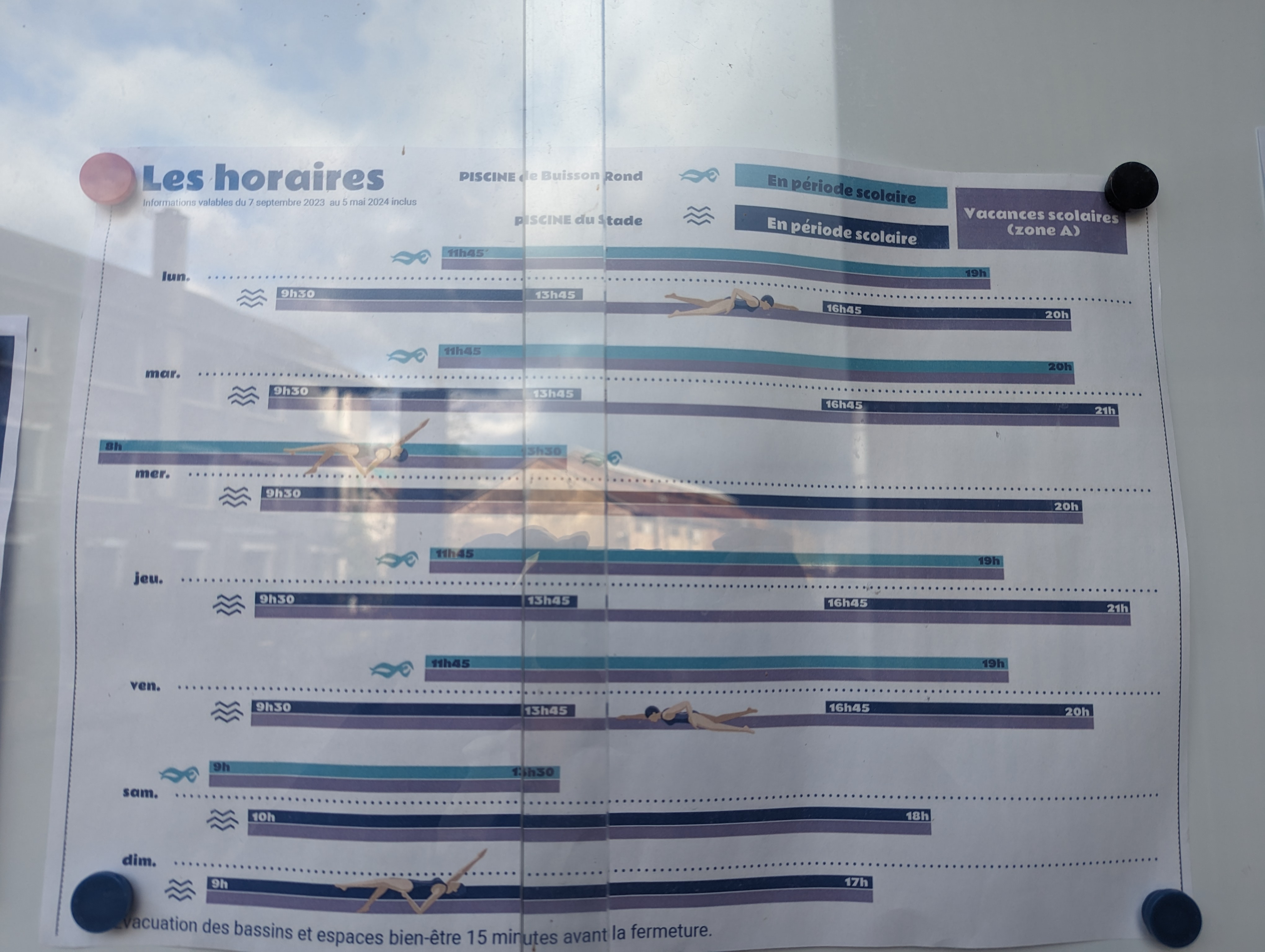 Belle piscine mais on m'a refusé l'accès une fois avec le sac à langer de ma fille pour une question de vigipirate apparemment, pas de problème je respecte mais je comprends pourquoi les autres peuvent accéder à la piscine avec des sacs cabas ou des sacs de sport.. je comprend pas la différence.. Ensuite on ma refusé l'accès avec la bouée spécial bébé avec harnais.. n'importe quoi, du coup obligé de porter constamment bébé....