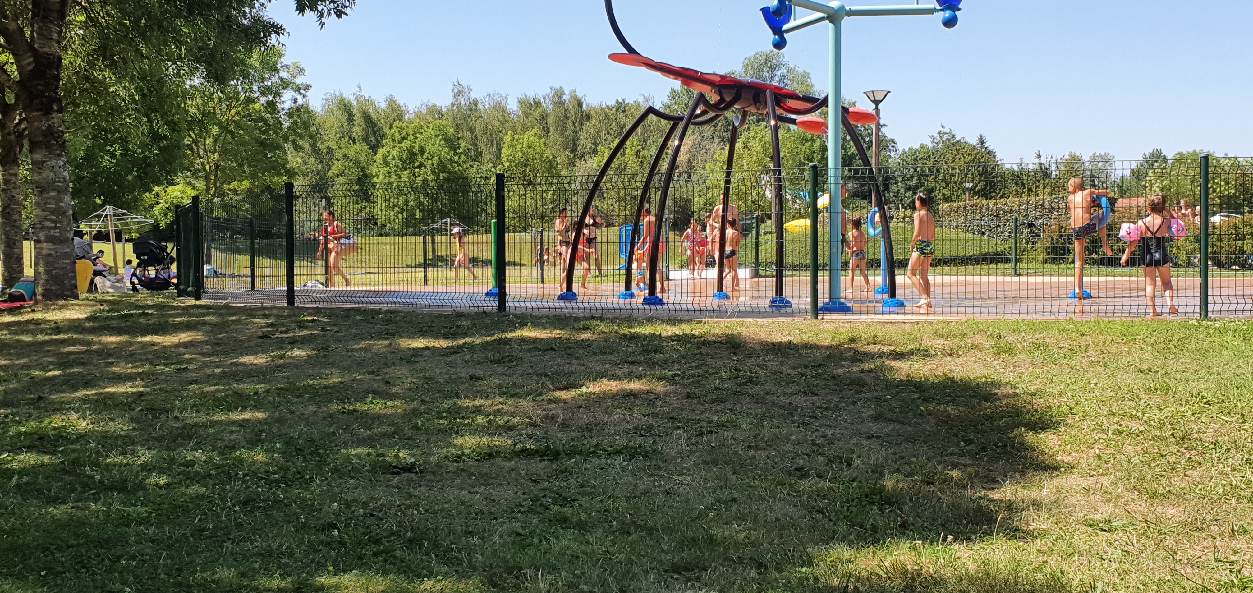 coin à l'ombre dans l herbe on peu manger et fumer sans problème bonnet de bain pas obligatoire jeux d'eau pour les tous petits et grand toboggan pour les grand vraiment génial
