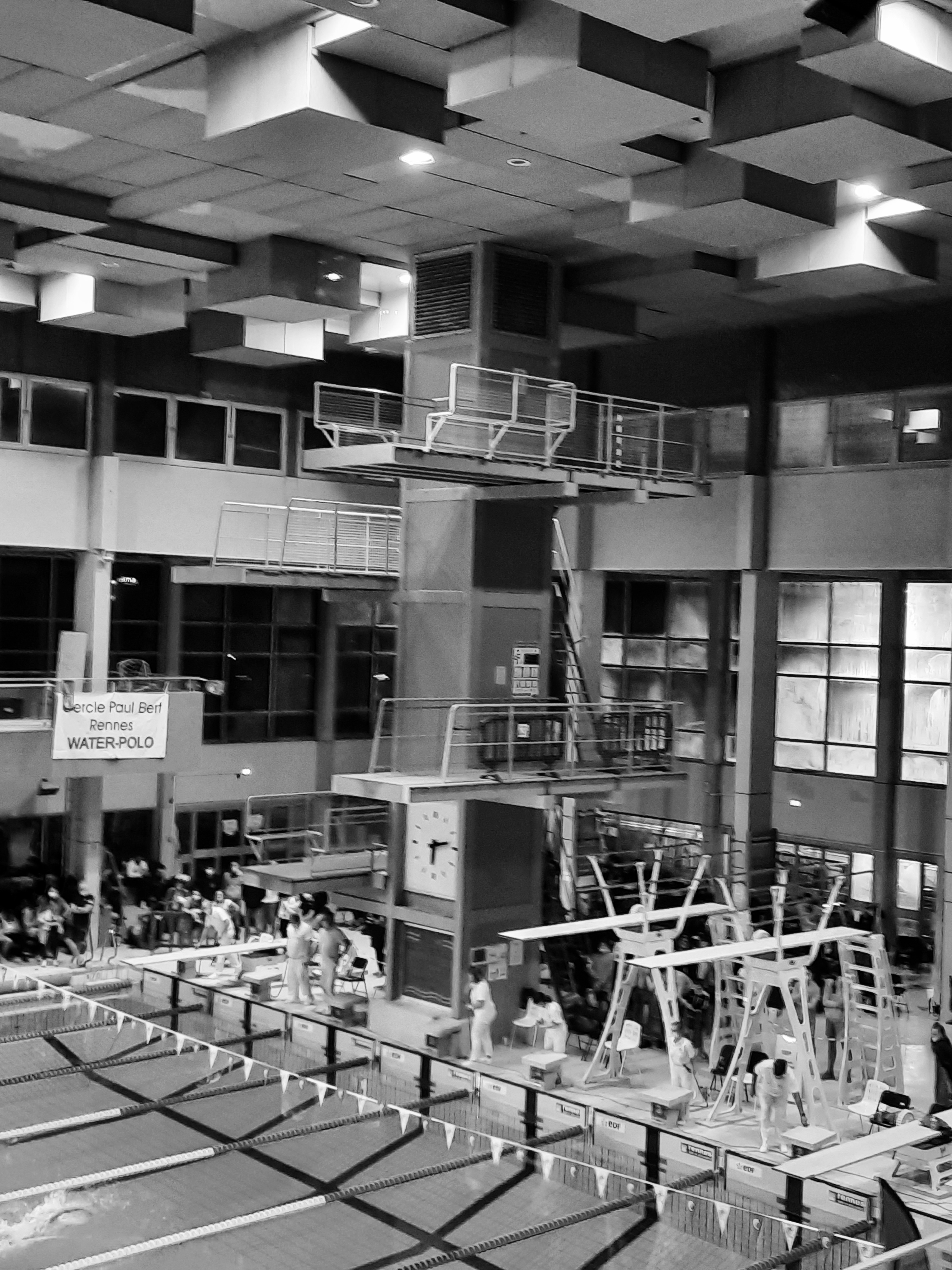 La piscine de Bréquigny à RENNES (Ille-et-Vilaine) est une des rares piscines couvertes en France à être dotée d'installations complètes de plongeon avec tremplins de 1m & 3m Maxiflex-B ainsi que des plates-formes de haut-vol de 5m à 10m de hauteur. Ces plongeoirs sont accessibles au public sur des horaires et jours définis (w.e. et vacances). Qui plus est, un club de Plongeon acrobatique avec encadrement adéquat enseigne cette activité (rare en France) en cursus Loisirs Adultes (lycéens - étudiants - post étudiants) ; ceci pendant chaque saison universitaire, sur des créneaux horaires adaptés (mercredi en soirée pour cours encadrés et samedi midi pour pratique libre). Pour la reprise de saison 2023-2024, les cours de plongeon acrobatique (nouveaux adhérents) débuteront mercredi 13/09/2023 à 19h45 à la piscine de Bréquigny. Le club permet de s'inscrire à l'activité au plus tard fin décembre, pour la saison en cours. [Daniel C., Encadrant BF2/ENF3 Plongeon au Cercle Paul Bert de Rennes, avis initial 04/2019, mis à jour 09/2023].