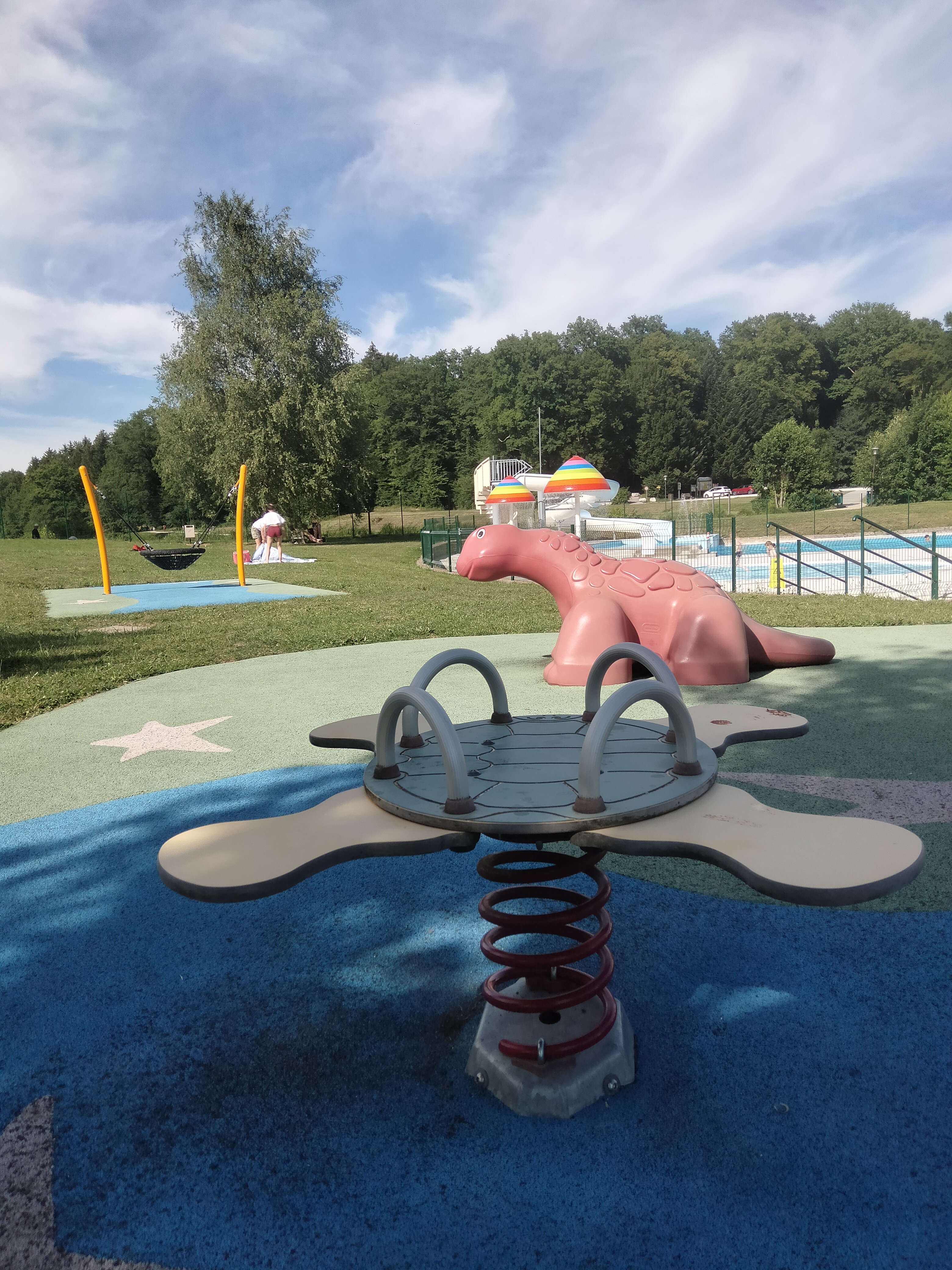 Une jolie petite piscine rurale, toute rénovée 🤩 !!! en fait, tout est petit, 👀 mais suffisant...... Très familiale, c'est plutôt sympa !✴️ Le bassin principale, assez modeste, à une profondeur maxi de 1,55m.!! .....il y a un petit toboggan 💦 et son bac de réception ! Une pataugeoire hexagonale et aussi : de petits jets d'eau droits et en forme de champignons 🍄 multicolores pluvieux 🚿..... quelques tables parsèment le parc, une dizaine d'arbres 🌳 procurent l'ombre nécessaire.🍃 il y a des jeux pour les enfants dont une petite balançoire !!! Un très grand parking 🅿️ se trouve juste à proximité !!!..... voilà, j'ai passé un bon moment 🐛, l'ensemble est très propre !! à refaire.........et, c'est évident, j'y reviendrai 🔥