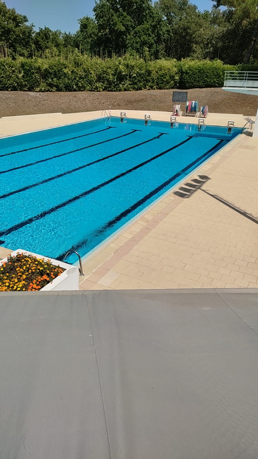 Jolie piscine avec 1 grand bassin 25 m x 12.5 m de 1m40 à 4m50 de profondeur et un autre bassin plus petit ou tout le monde a pieds !...pas beaucoup d'ombre... pas trop de public ... snack fermé sûrement pour protocole sanitaire covid ...