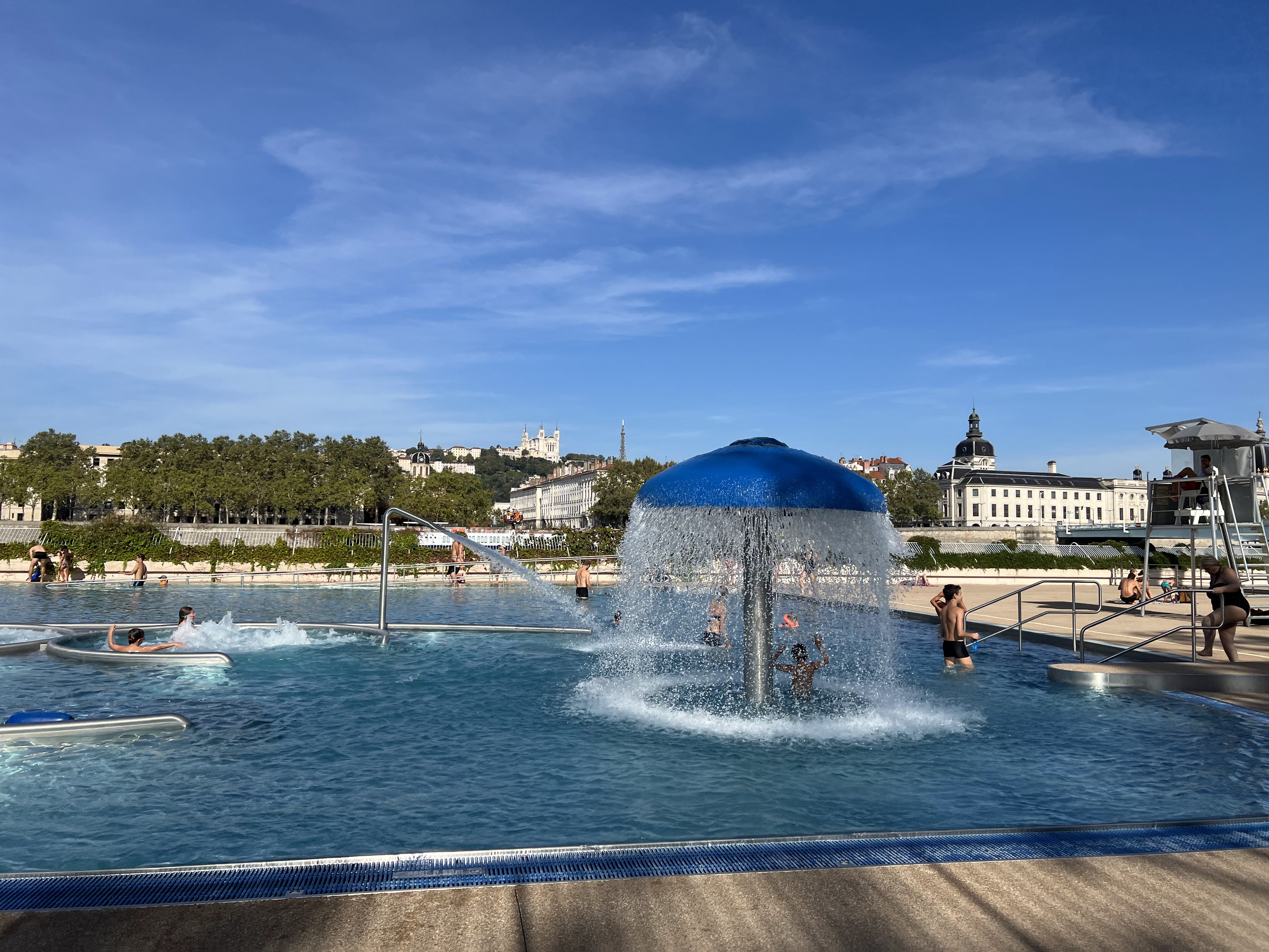 Très grande piscine sur les quais du Rhône, avec sièges dans l’eau, jets d’eau et toboggans Entrée 5€50