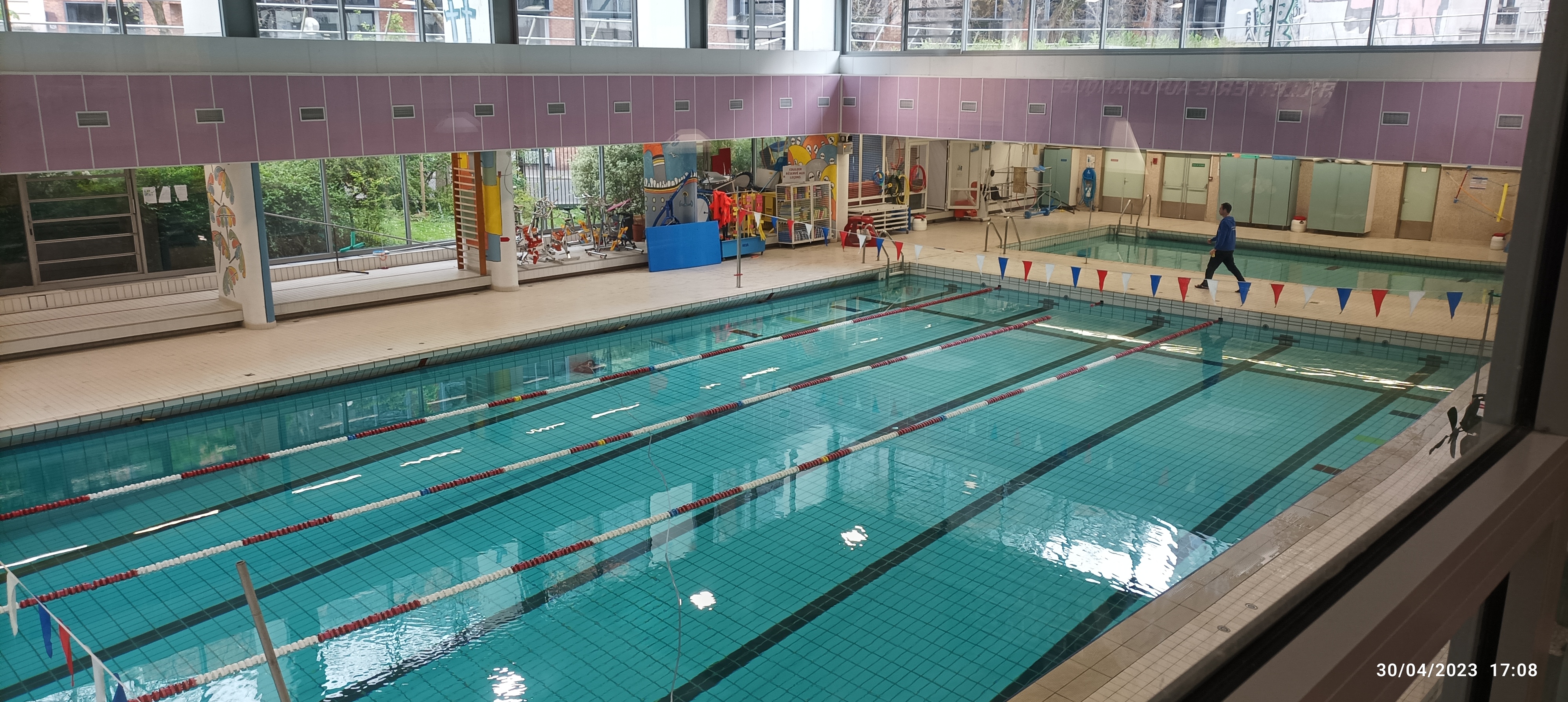 Piscine de quartier.. ouverture au public réduite en période scolaire.. mais les enfants doivent savoir nager, donc priorité nécessaire..