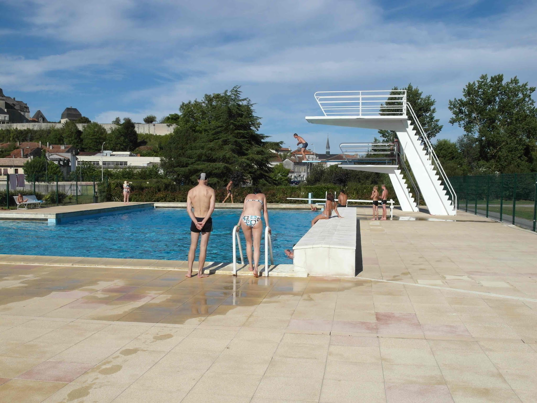 Fréquentée en juillet 2020, juillet 2017 et août 2013, la piscine de CHALAIS, en Charente est un petit établissement découvert qui dispose d'un bassin en L, avec des plongeoirs de 1m à 5m sur une zone dédiée à cette activité. Ces installations de plongeon constituent un plus par rapport à bien d'autres piscines (parfois plus luxueuses mais sans originalité) et qui n'en disposent pas. Les plongeoirs sont exactement composés de : - une planche de hauteur 1m, - une planche de hauteur 3m avec bosse de réglage, - une plate-forme de 5m. Cet établissement estival très agréable est bien tenu. Les plages qui bordent le bassin ainsi que les pelouses permettent de se détendre entre deux ploufs, lors d'un long w.e. d'escapade passé dans la Charente. [Daniel C., Juge national de Plongeon à la Fédération Française de Natation, Encadrant BF2/ENF3 Plongeon au C.P.B. Rennes, 11/07/2020].