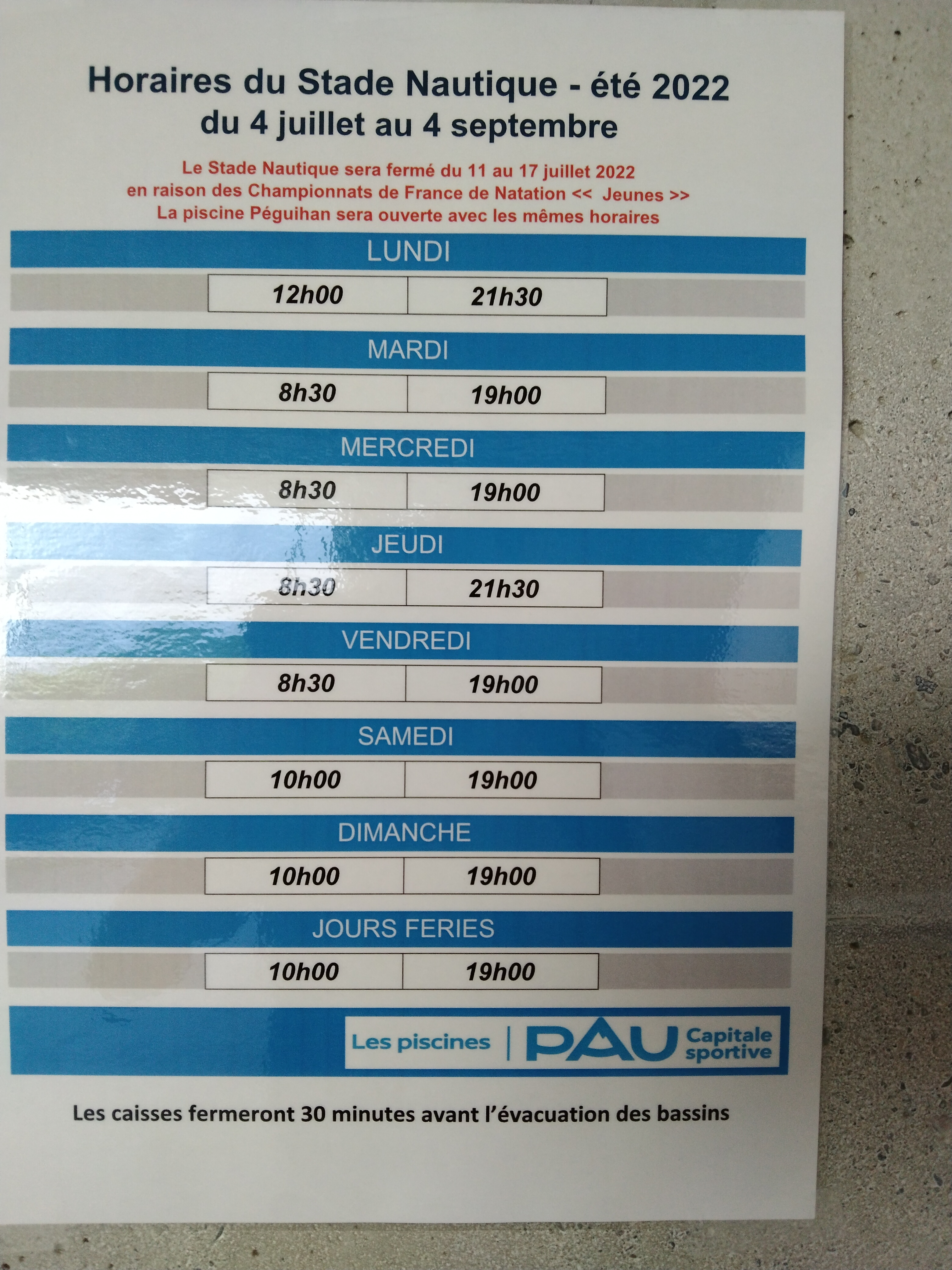 Super piscine mais savent pas communiquer sur les bons horaires : les horaires d'été ne sont pas ceux indiqués sur maps ni sur le site de Pau.fr. Belle erreur 404 page non trouvée